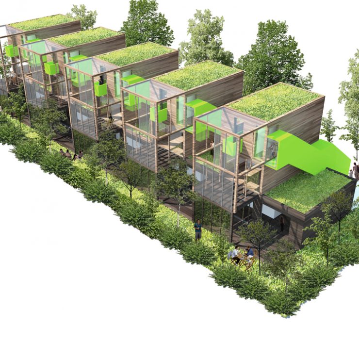 La conception des habitations tente d’approcher la maison passive. Des serres au sud permet un apport de chaleur pour les saisons froides dans les logement. En effet cette effet de serre peut permettre de faire bénéficier de 30% d’apport calorifiques de chauffage passif à l’année. Les serres sont aussi un espace supplémentaire pour le logement qui agrandi le séjour. Elles sont utilisables comme des jardins d’hiver ou ouvertes comme des terrasses.