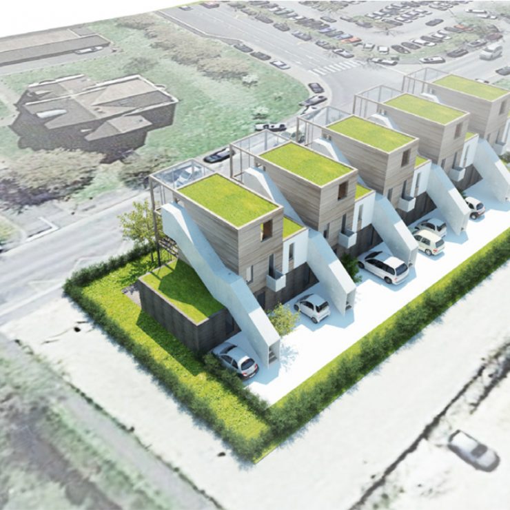 On peut lire une morphologie tenant l’ensemble du site comme un petit collectif se rapprochant des grands ensembles voisin. Une autre lecture est possible celle de la composition à échelle de la maison individuelle en bande et ou superposé.