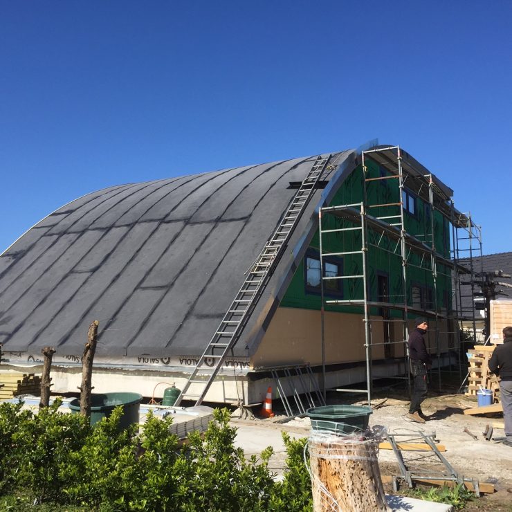 Le concept du projet s’est donc basé sur la reprise de la volumétrie de la maison existante qui possédait une toiture en chaume courbe et la volonté de rappeler l’environnement et le paysage de dune de la région.
