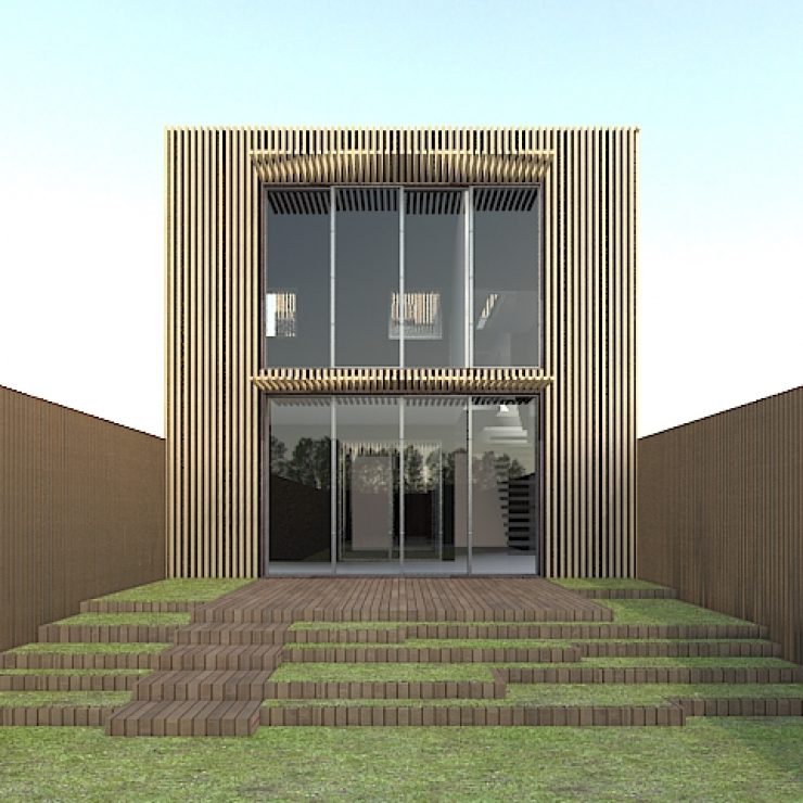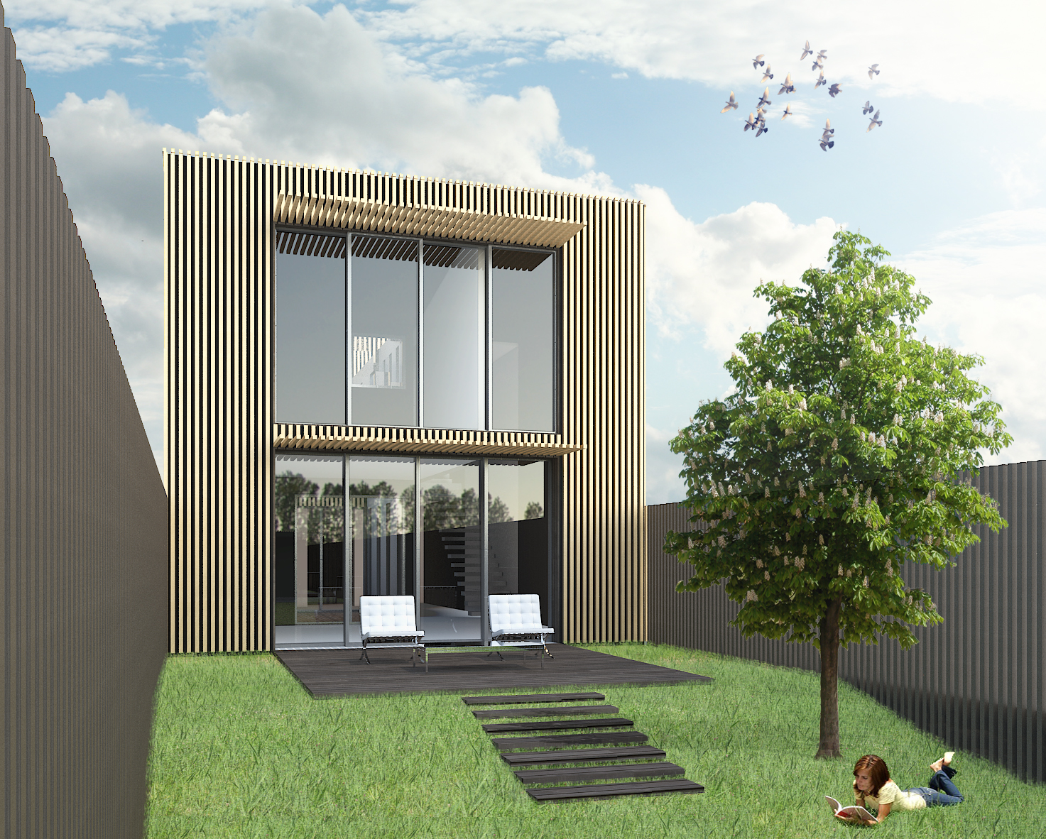 Jeux des enfants. Dans le deuxième volume sur le jardin arrière se développe le grand séjour et la cuisine avec une double hauteur donnant sur le premier étage et la chambre parentale. La maison des enfants est reliée conceptuellement par un pont à la maison des parents. Ce volume est un couloir de transition entre les deux volumes : au rez-de-chaussée il relie les espaces d’entrée avec le grand séjour , et un escalier pour accès à l’étage et une passerelle reliant les deux volumes au premier étage.