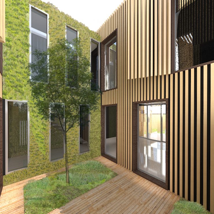 Cette implantation permet de créer ainsi un jardin avant avec possibilité de se garer et l’accès au garage couvert. Le patio permet d’apporter de la lumière sur les façades des chambres au nord et au sud et dans l’espace pont qui ne représente pas des pièces principales.